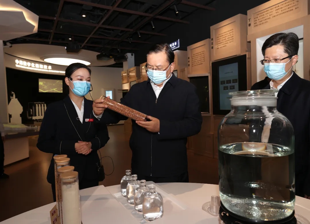 在劲牌展馆,王忠林省长听取企业经营情况介绍,参观产品陈列,深入了解劲牌保健酒中医组方原理及三香原酒基地和粮食原料,并重点观看了数字提取工艺、抗疲劳功效实验、劲酒923提高免疫力组合和毛铺酒核心专利。调研中,王忠林对劲牌公司发展成效给予肯定。他叮嘱劲牌加强自主研发,不断增强核心竞争力,勉励劲牌继续努力。